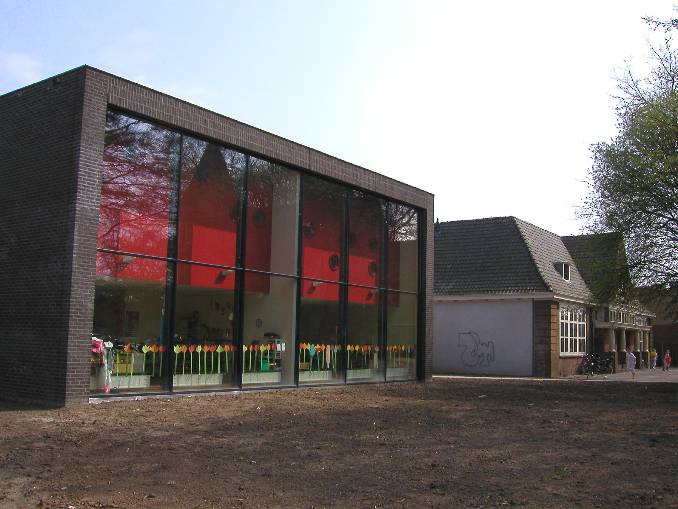 De uitbreiding met 4 lokalen, een speellokaal en personeelsvoorziening is ontworpen als een los gebouw met een glazen gang gekoppeld aan de bestaande “historische” school.
