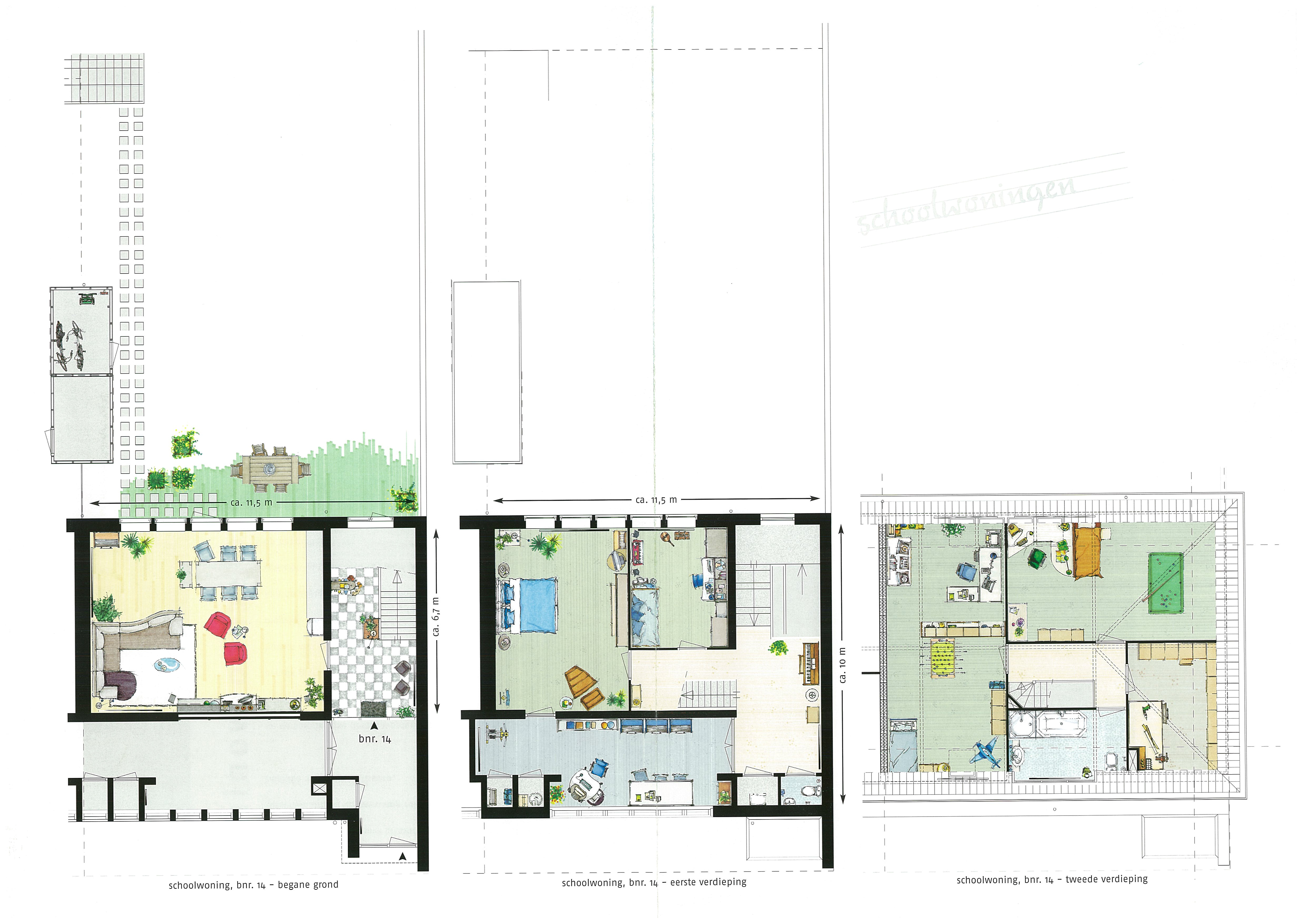 Na een lang en ingewikkeld proces is de school verbouwd tot 6 woningen. Er is uiteindelijk gekozen voor een indeling met grote woningen in een verticale verdeling, twee lokalen boven elkaar plus het zolderdeel daarboven . De lang gang op de begane grond aan de Melis Stokestraat is blijven bestaan als ontsluiting van deze vijf woningen. De “toren” met het hoofd trappenhuis en de personeelsvoorzieningen aan de Van der Mondestraat vormen samen één woning. Helaas hebben de kopers besloten in het trappenhuis vloeren aan te brengen zodat dat niet meer als geheel te zien is.